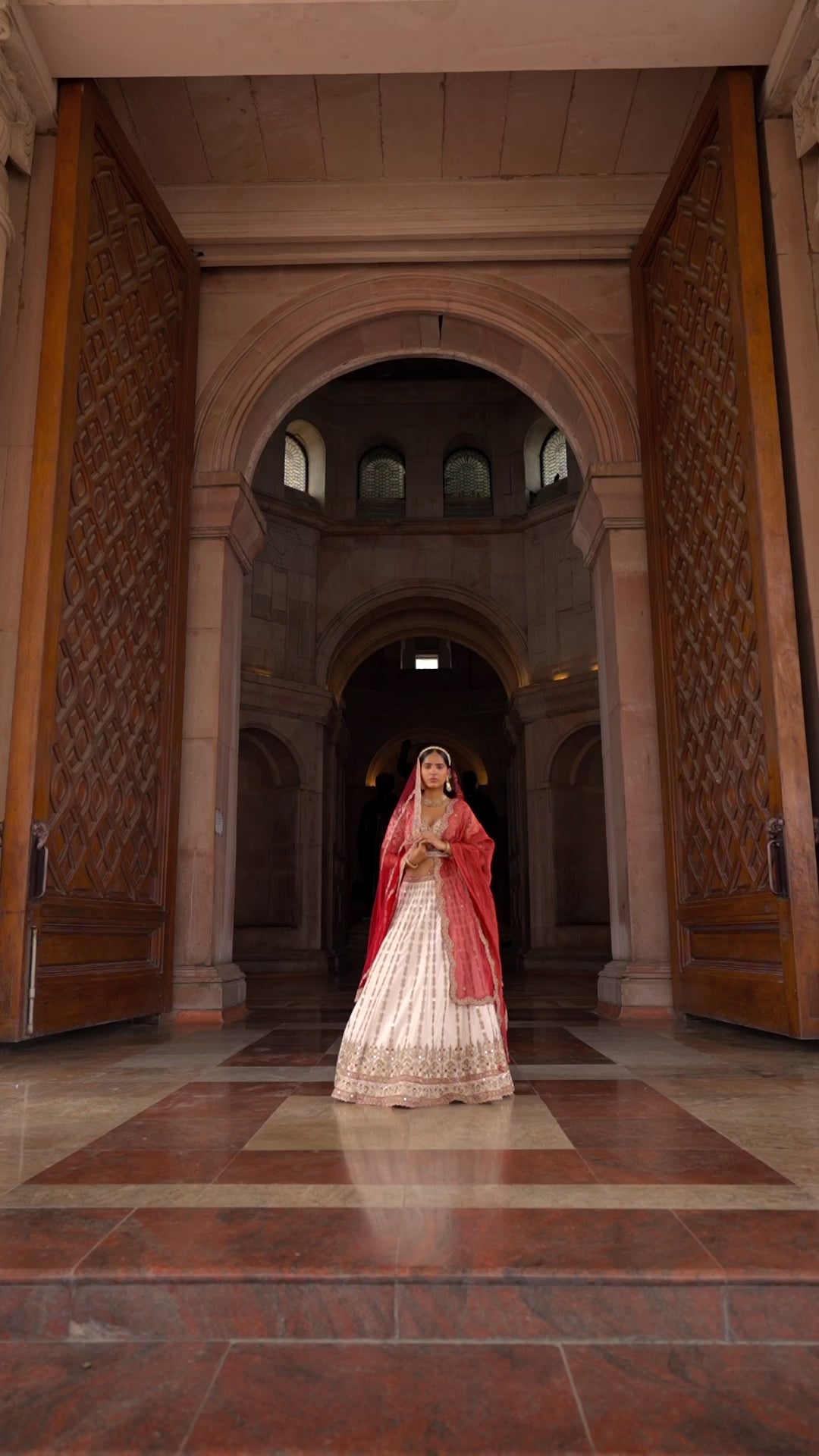 Ivory Tafetta Bridal Lehenga Choli Set with antique embroidery accented with red accompanied with a red tulle dupatta and an optional tissue stripe second dupatta. (Additional dupatta is chargeable separately)