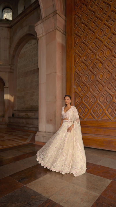 Ivory Tulle Lehenga Choli dupatta set with tonal sequins jaal and contrasting floral embroidery with a worked belt.