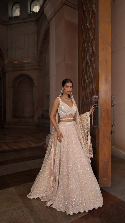Nude Pink Tulle Lehenga Choli Dupatta with belt worked in tonal and ivory sequins beadwork and crystals.