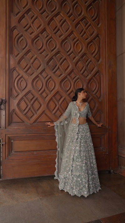 Sage Green Tulle Lehenga Choli Set is heavily embroidered in a floral pattern with tonal beads, sequins, and crystals with some rose highlights.