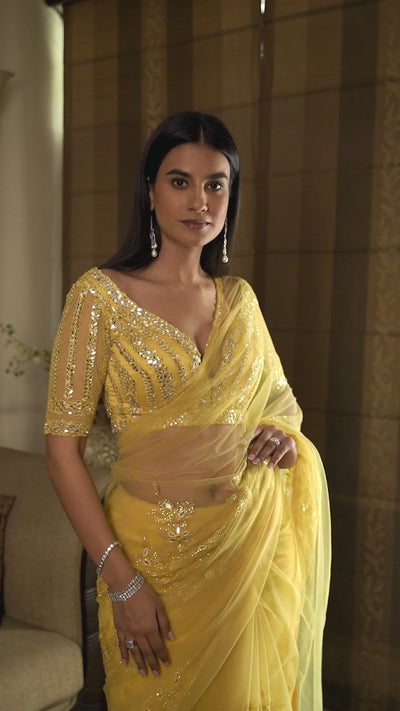 Sunburst yellow tulle saree blouse, embellished with mirrors & patra.
